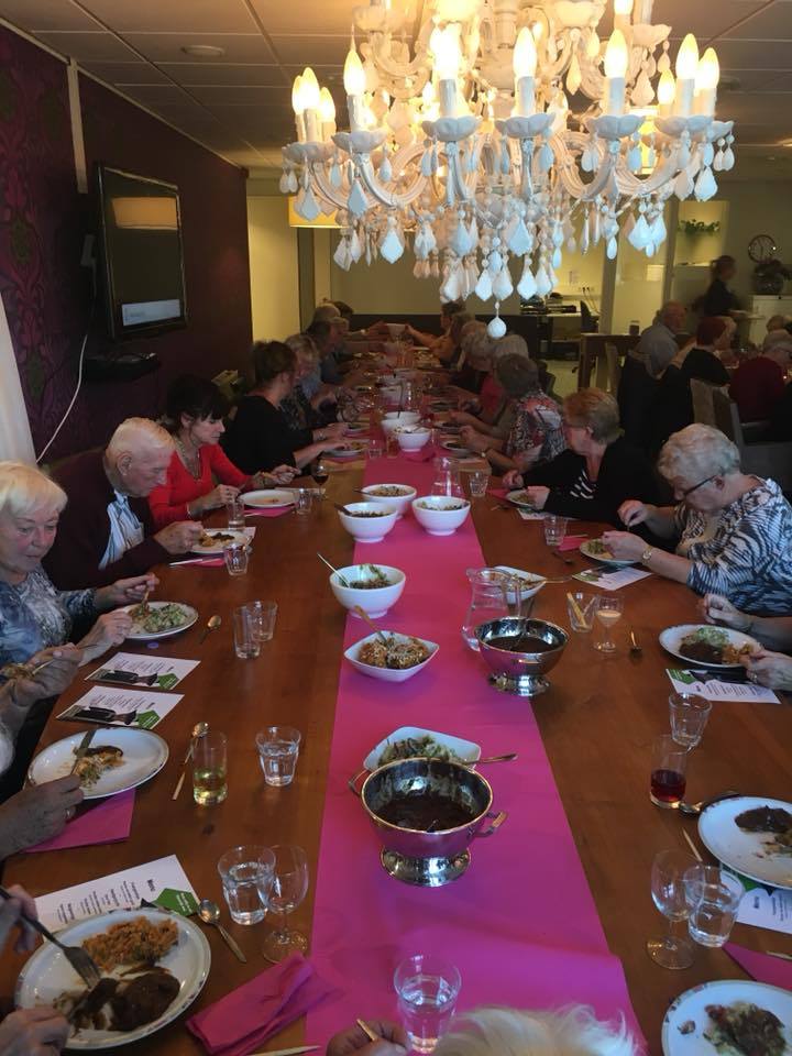 Onder het motto “Kom erbij” werd er een driegangendiner geserveerd, bereid door de Voedingsdienst van ZuidOostZorg. Met behulp van vele vrijwilligers en sponsoren werd het diner voor het vijfde jaar een hele mooie avond, waar zelfs door sommigen een dansje werd gewaagd.