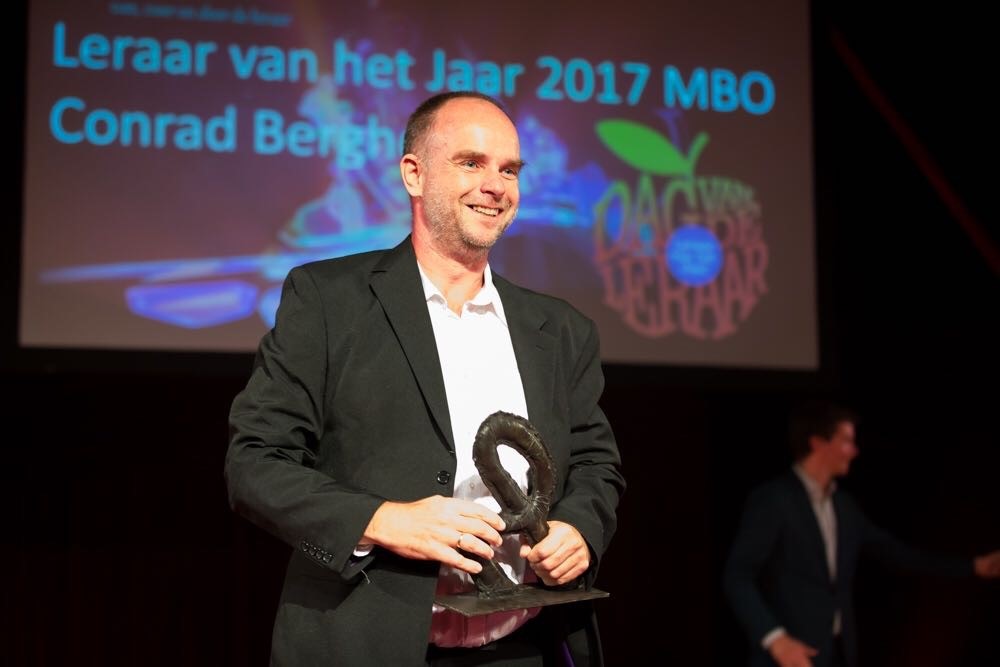 DRACHTEN – Docent Conrad Berghoef van ROC Friese Poort is mbo-docent van het jaar geworden in de landelijke verkiezing voor Leraar van het Jaar. Dat maakte minister Jet Bussemaker zaterdag bekend tijdens het Lerarencongres. “Een docent die zichzelf totaal in dienst stelt van zijn studenten”, aldus de jury. De docent Nederlands weet door de inzet van verschillende media zijn studenten bij de les te houden en te inspireren.