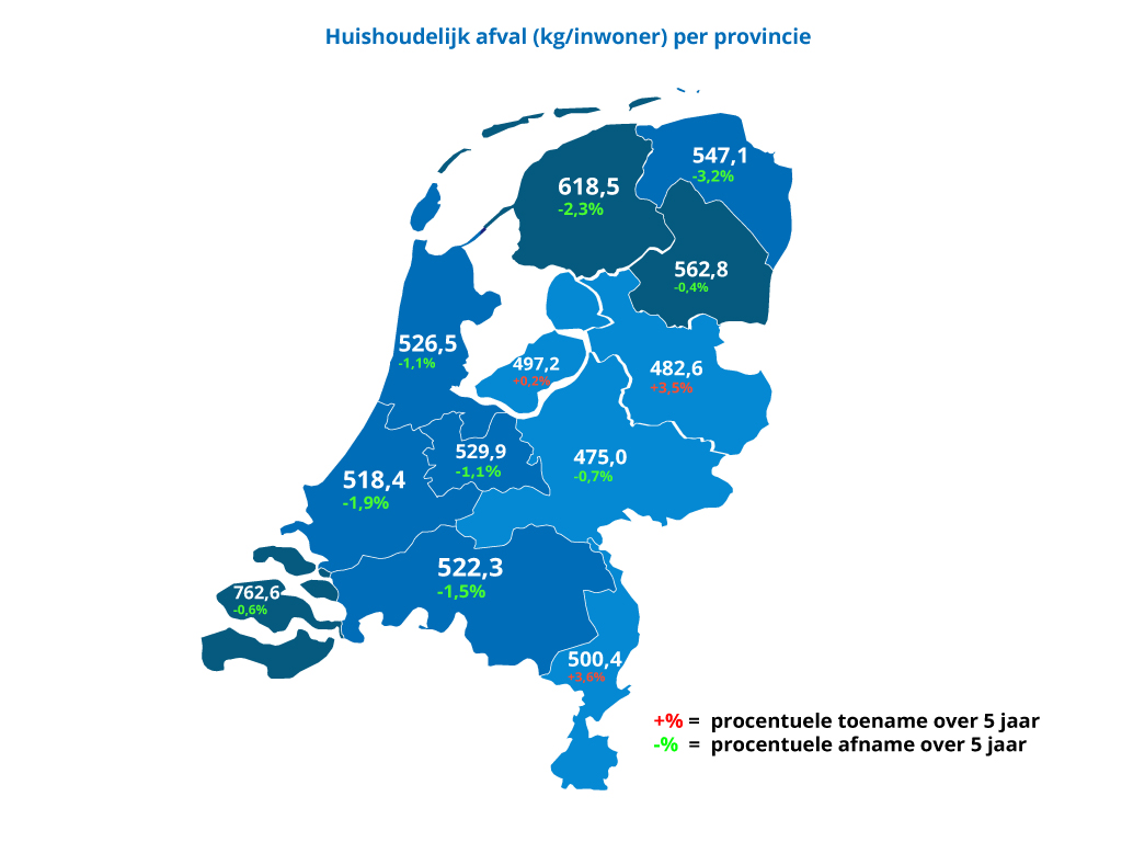 Op provinciaal niveau bestaan er vrij grote verschillen in de gemiddelde hoeveelheid huishoudelijk afval per inwoner. Zeeuwen produceren met 763 kilo persoon veruit het meeste afval. Friezen produceren met een jaarlijks gemiddelde van 618 kilo per inwoner ook aanzienlijk meer huishoudelijk afval dan inwoners van de overige provincies.