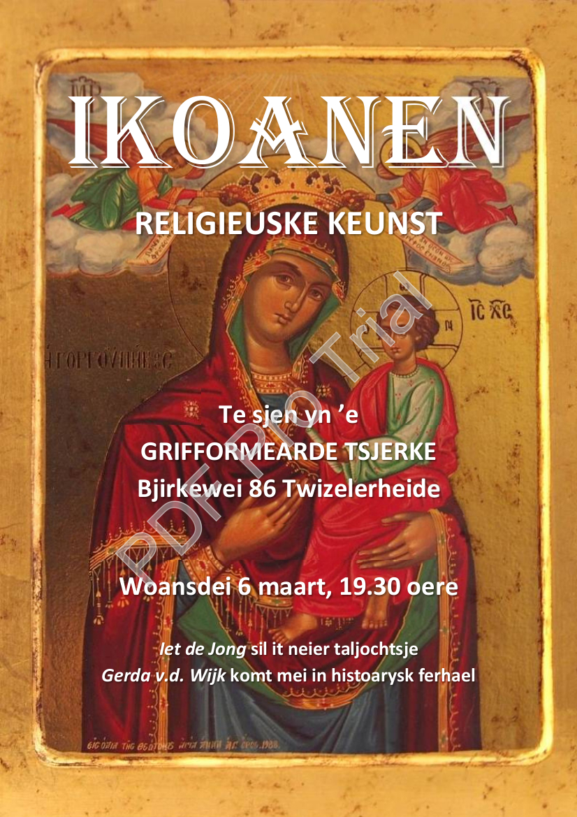 Een twintigtal iconen uit Rusland, Bulgarije en Griekenland, afkomstig uit particulier bezit, zal worden samengebracht in de Gereformeerde Kerk van Twijzelerheide. De internationale collectie geeft een goed beeld van de diverse vertakkingen binnen de wereld van de iconen. De tentoonstelling zal toegelicht worden door Iet de Jong. Bovendien zal verteller Gerda van der Wijk een historisch verhaal ten gehore brengen.