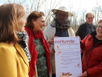 HURDEGARYP -Vrijdag 9 maart ondertekende wethouder Ellen Bruins Slot het convenant Bijvriendelijk handelen. De gemeente legt daarmee vast dat zij ervoor zorgt dat bijen in Tytsjerksteradiel goed kunnen leven. De ondertekening was in de Dorpstuin in Hurdegaryp.