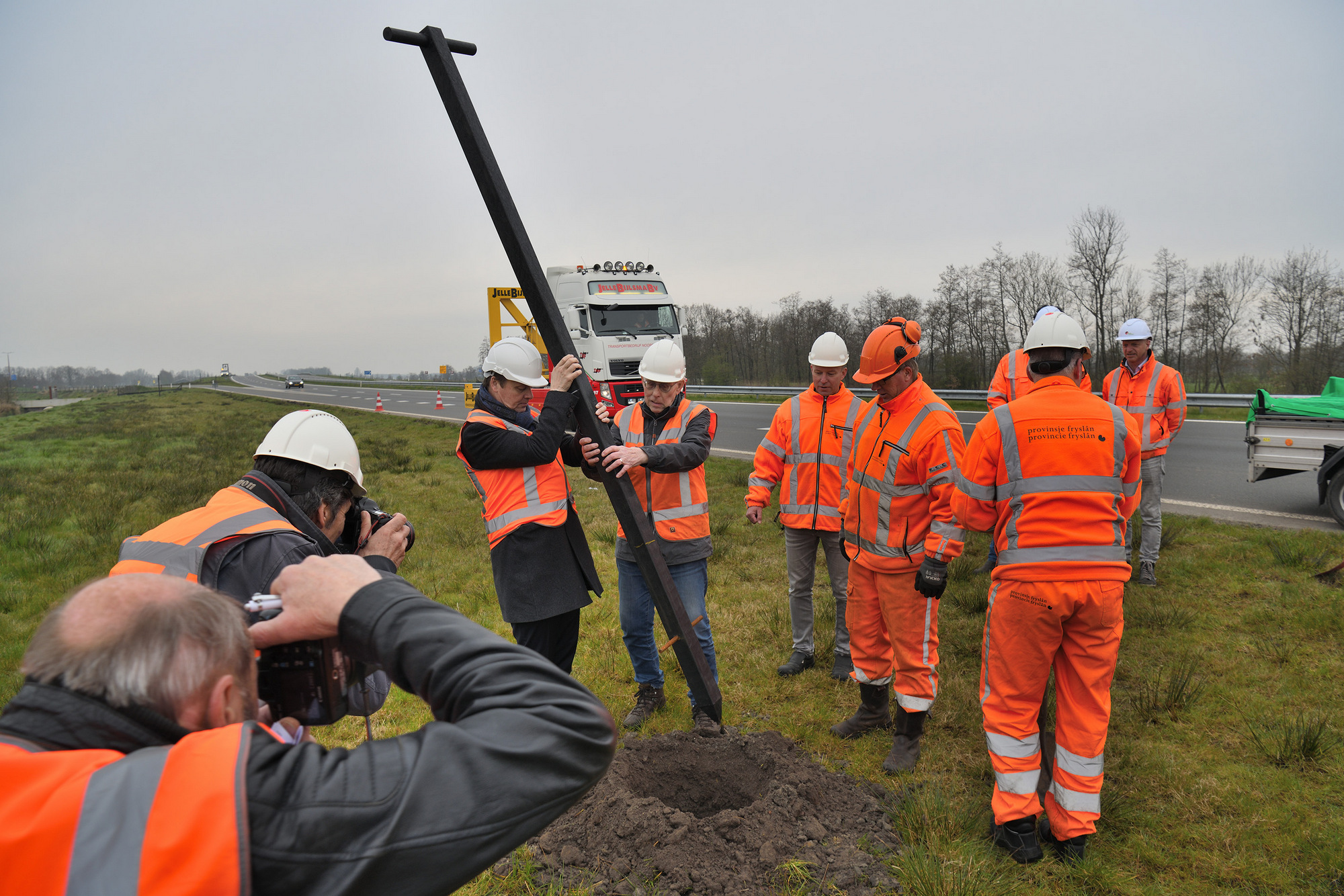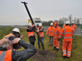 De maatregelen moeten voorkomen dat uilen worden doodgereden. Vanaf de nieuwe hoge palen kunnen de vogels veilig wegvliegen over het verkeer heen. Gedeputeerde Johannes Kramer en voorzitter van de Kerkuilenwerkgroep Johan de Jong plaatsten vandaag – donderdag 4 april – samen een nieuwe paal, gemaakt van gerecycled materiaal.