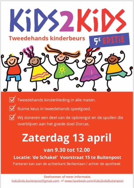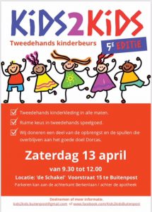 BUITENPOST – Zaterdag 13 april vindt de vijfde editie van de Kids2Kids kinderbeurs plaats. Tweedehands kinderkleding en speelgoed wordt deze dag verkocht tegen leuke prijzen.