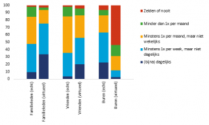 Bij de 75-plussers is er juist weinig verschil tussen de frequentie van echt en virtueel contact. Zij zien hun vrienden dus even vaak in het echt als virtueel. De mate van virtueel contact neemt over het algemeen af met leeftijd.