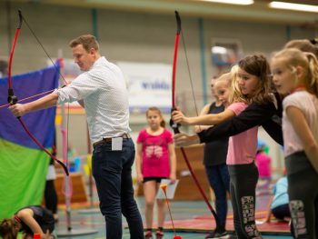 Foto: Wethouder Jouke Spoelstra schiet met de handboog tijdens het parcours met sportonderdelen.
