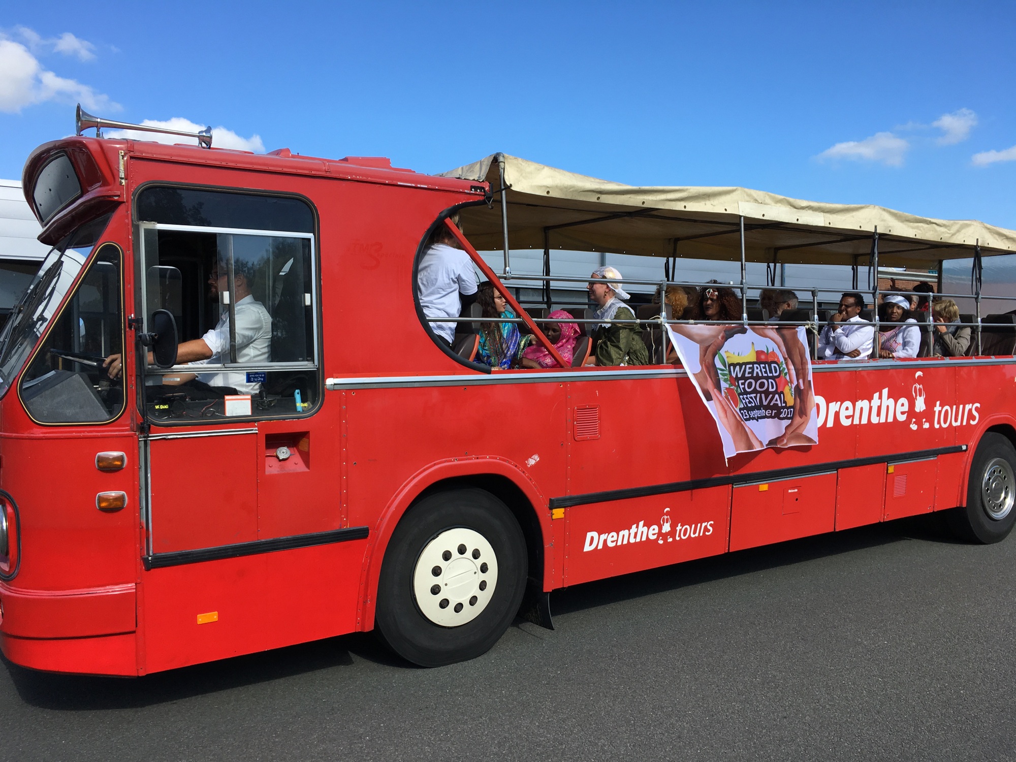 BUITENPOST – Afgelopen weekend heeft het Wereld Food Festival op het erf van Cadeauwinkel Op ‘e Stâl in Buitenpost plaatsgevonden. Een optocht met ludieke en historische vervoersmiddelen en een cabriobus vol met mensen in internationale klederdracht trok als eerste door Buitenpost.