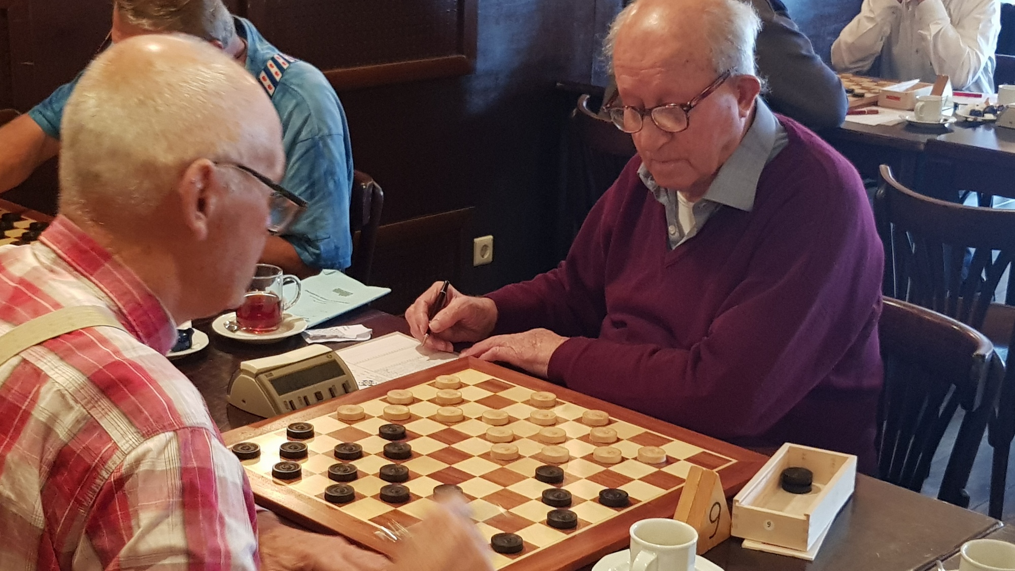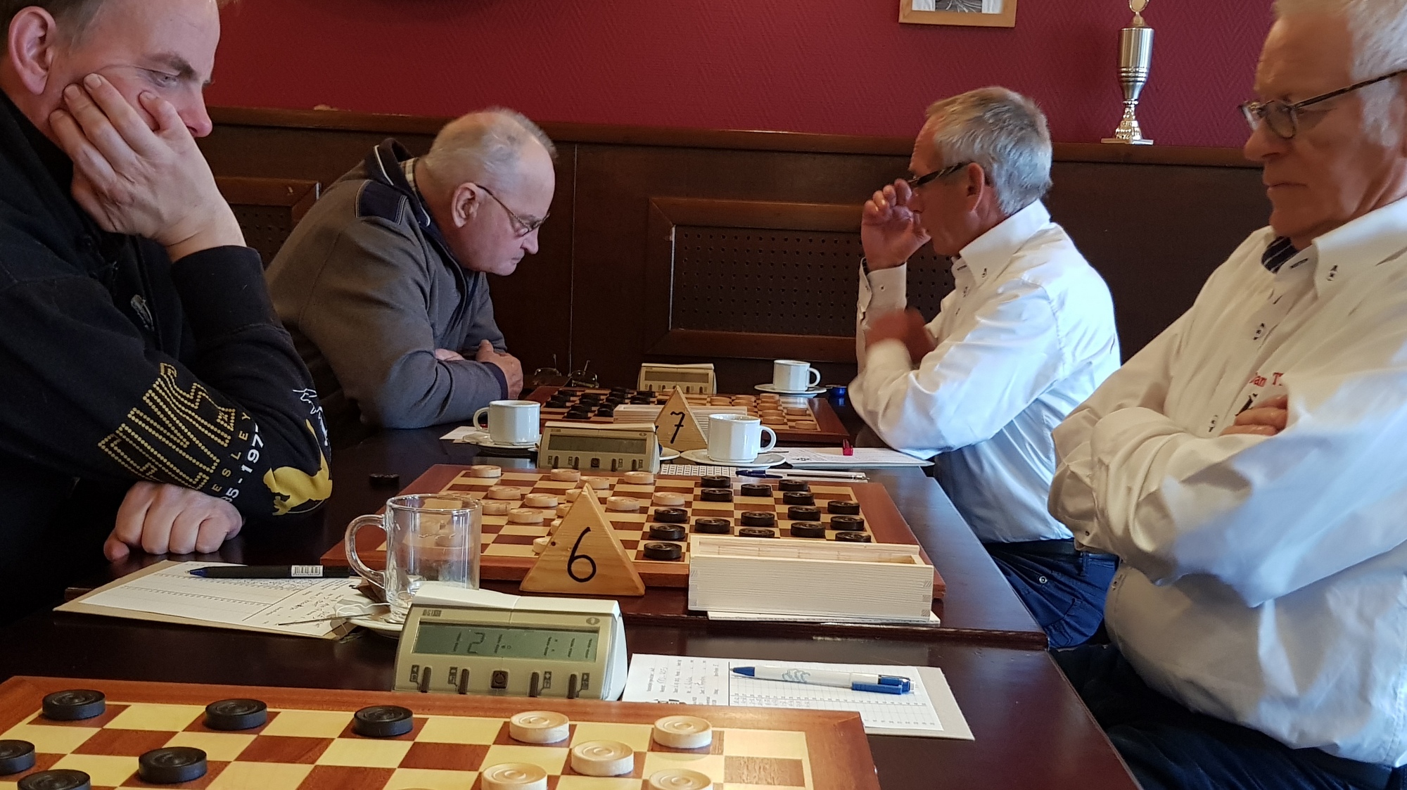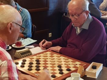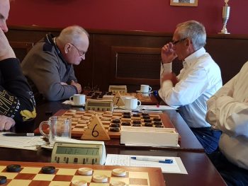 De veteraan van DCF Durk Douma probeerde Jan Kunnen met een slagzet om de oren te slaan. Door een foute slagkeuze van Jan lukte dit en was de pot verloren. Had Jan anders geslagen dan had hij een brikje voorsprong kunnen nemen. Helaas dit soort dingen gebeuren. Naast deze mannen waren het Symen Atsma van de thuisclub en Koop de Vries die de remise overeen kwamen. Toen had kersvers DCF lid Jan Sloot al een schijf achterstand tegen Ype Kroodsma. Jan zwoegde voort verloor nog een schijf en moest in Ype zijn meerdere erkennen. Geen goede start voor zijn nieuwe club.